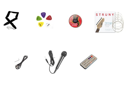 pasekgitarowy , kostki do gry, kurs DVD, struny zapasowe, kabel, mikrofon oraz pilot do wzmacniacza.