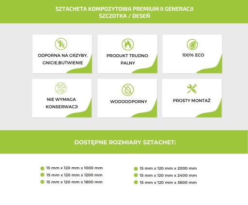 Kompozytowe sztachety Premium drugiej generacji to innowacyjne rozwiązania w produkcji kompozytu drewna na świecie. Dynamiczny rozwój technologii pozwolił stworzyć produkt przewyższający swoimi parametrami tradycyjne rozwiązania.Sztacheta Kompozytowa nowej generacji Premium to produkt wysokiej jakości. Dzięki nowoczesnej technologii produkcji sztacheta ma charakterystyczną strukturę naturalnego usłojenia. Deseń drewna jest wytłaczany na powierzchni za pomocą pras w wysokich temperaturach z nałożoną zewnętrzną powłoką polimerową, która otacza sztachetę ze wszystkich stron i chroni ją przed plamami oraz utratą koloru. Dzięki tej metodzie produkcji jest też trwała i odporna na ścieranie. Druga strona jest w innym uszlachetnieniu-szczotkowana przez co sztachetę możemy stosować na dwie strony w zależności od preferencji.