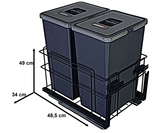 Zestaw składa się z dwóch koszy z pokrywami, stalowego stelaża, wysokiej jakości prowadnic dolnego montażu z funkcją pełnego wysuwu i cichego domyku oraz kompletu mocowań.