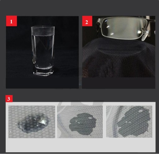 - 3 - Test rozlanej kropli przedstawia bardzo dobre właściwości termiczne, szybkoschnąca tkanina perfekcyjnie wchłania wilgoć.