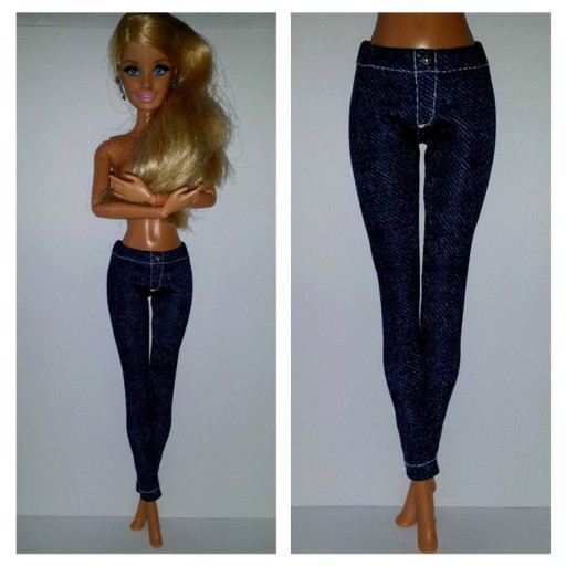 Przedmiotem sprzedaży są legginsy dla lalek z plastikowymi nogami. Uszyte z dzianiny imitującej granatowy jeans na gumce. Ozdobione srebrnym koralikiem.