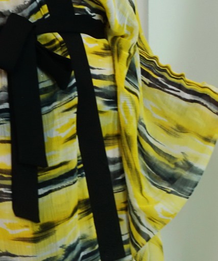 Szyfon, z którego wykonaliśmy nasze kimono jest lekko przezroczyste, co nadaje mu lekkości i zwiewności. Dzięki temu stanowi bardzo subtelny i delikatny element odzieży.