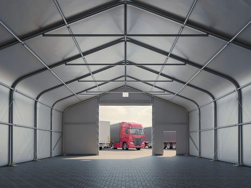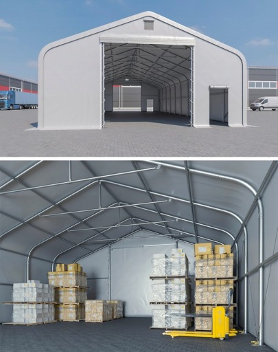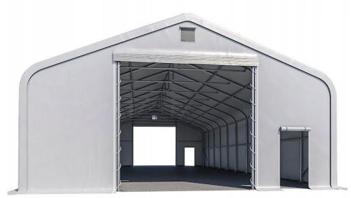 Konstrukcja, plandeka, ściana szczytowa z dużą bramą i wejściem dla ludzi.