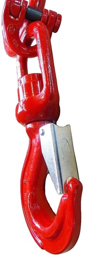 WYKONANIE: Hak obrotowy z ogniwem zbiorczym /kolucho/, krętlik na łożysku kulowym pozwala swobodnie obracać się wokół własnej osi pod obciążeniem - połączony złączką łańcuchową . Zestaw malowany proszkowo, wykonany ze stali kutej matrycowo, hartowanej w klasie wytrzymałości 8. Hak posiada zapadkę zabezpieczającą przed wypięciem liny