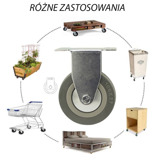 - KOŁO składa się z polipropylenowej piasty oraz z niebrudzącej gumowej opony, posiada łożysko ślizgowe. Kółka mają wytrzymałość po 80kg na kółko. Wolno się zużywają, są odporne na uszkodzenie, amortyzują uderzenia i wibracje. Obracają się o 360 stopni ułatwiając manewrowanie meblami czy wózkiem. Gładko obracają się po twardych i gładkich powierzchniach jak beton przy bardzo małym tarciu.