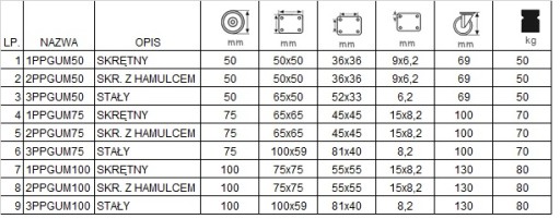 - KOŁO składa się z polipropylenowej piasty oraz z niebrudzącej gumowej opony, posiada łożysko ślizgowe. Kółka mają wytrzymałość po 80 kg na kółko. Wolno się zużywają, są odporne na uszkodzenie, amortyzują uderzenia i wibracje. Obracają się o 360 stopni ułatwiając manewrowanie meblami czy wózkiem. Gładko obracają się po twardych i gładkich powierzchniach jak beton przy bardzo małym tarciu.