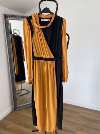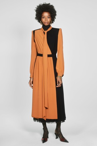 Sukienka z wysokim kołnierzem, wiązaniem, długimi rękawami i wyrazistymi ramionami. Plisowana spódnica. Zapinana z przodu na dwurzędowy guzik.