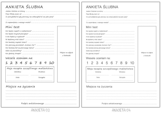 Księga gości zawiera 50 kartek na których wydrukowane są ankiety, dodatkowo blok ozdobiony jest kapitałką oraz zakładką z białej tasiemki. Ankiety wydrukowane są na stronach nieparzystych, strony parzyste są białe - bez nadruku. Dostępne wzory ankiet prezentujemy poniżej.