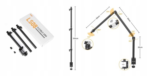 Uniwersalny statyw dzięki któremu umieścisz lampę, aparat, mikrofon, lub oświetlenie studyjne na blacie biurka. Długie ramię z głowicami kulowymi pozwala ustawić sprzęt pod dowolnym kątem. Możesz na nim umieścić aparat np. obiektywem w dół albo ponad swoimi notatkami czy ekranem komputera.