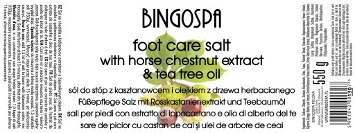 Sól BINGOSPA do stóp ze skłonnościami do pękających naczynek zawiera ekstrakt z kasztanowca - źródło escyny i olejek z drzewa herbacianego mający działanie bakteriobójcze, grzybobójcze, normalizuje również pracę gruczołów łojowych. Olejek działa również przeciwbólowo i ściągająco na pory skóry.