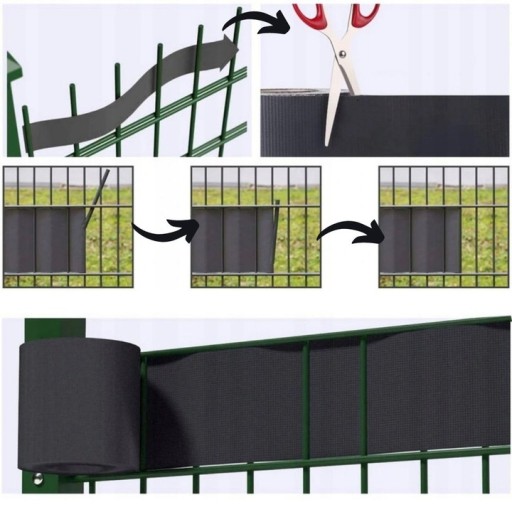- Przepleć taśmę między prętami ogrodzenia panelowego. Dobrze jest przeplatać taśmę naprzemiennie co 2-4 oczka ogrodzenia.