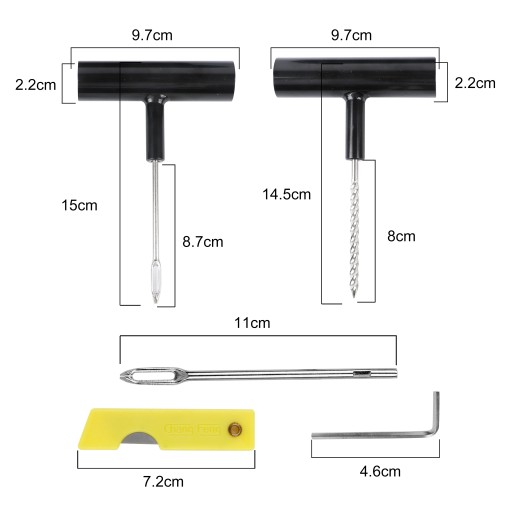 Spiralne tarniki i wkładki igłowe są wykonane z utwardzonej, piaskowanej stali dla zwiększenia trwałości. Narzędzia te są odporne na zabrudzenia i zabrudzenia za pomocą zwykłej ściereczki i wytrzymują wiele napraw opon.