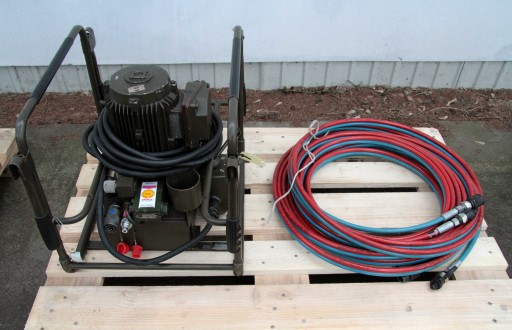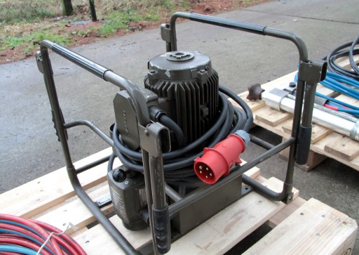 Agregat pompowy o maksymalnym ciśnieniu 520bar i maksymalnym przepływie 2,5l/min. Agregat pompowy zawiera jednocześnie zbiornik oleju hydraulicznego i reduktor