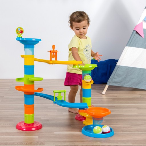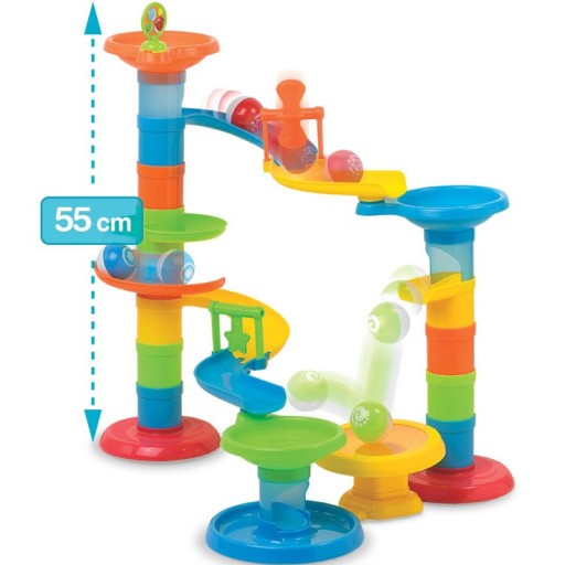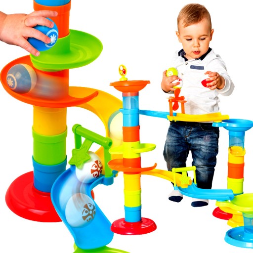 Hop Hop Bęc! Weź udziału w piłeczkowym pościgu i sprawdź, która kuleczka pierwsza dotrze do mety! Zbuduj wielką zjeżdżalnię z dwoma torami wyposażonymi w obrotowe elementy oraz trampolinę podrzucającą spadające piłeczki. Duży rozmiar upodabnia zabawkę do prawdziwej, pełnowymiarowej zjeżdżalni, by zabawa cieszyła podwójnie! Zestaw składa się z 30 elementów, które można dowoli składać i rozkładać.