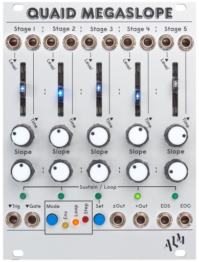 Quaid Megaslope to wysoce elastyczny, pięciostopniowy generator funkcji. Może działać w trzech różnych trybach: jako wielostopniowa złożona obwiednia, inspirowana serią Juno i Casio CZ, jako LFO (tryb pętli) lub jako sekwencer krokowy (tryb krokowy) z programowalnymi slajdami na krok. Istnieją dwa wyjścia, jednobiegunowe i dwubiegunowe, dla idealnej integracji z twoją łatą! Ponadto każdy stopień posiada ręczną i napięciową kontrolę poziomu i czasu.