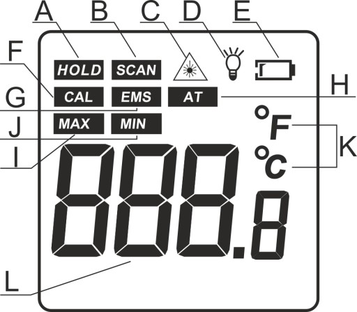 - EMS: emisyjność, która może zostać ustawiona w zakresie 0.10 and 1.00 przy użyciu przycisków,