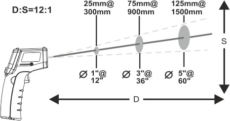 Wielkość punktu pomiaru zmienia się wraz z odległością w stosunku 12:1