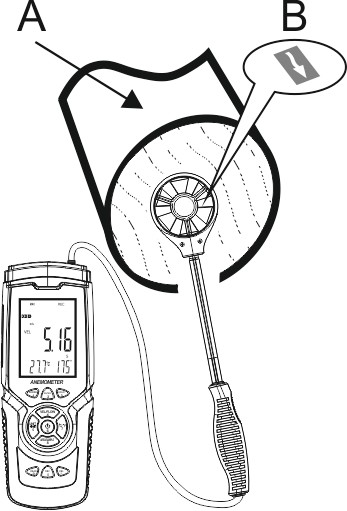 Umieść sondę pomiarową w obszarze kanału, aby od razu zmierzyć bieżącą wartość przepływu powietrza.
