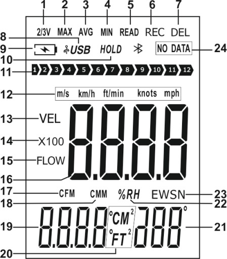 - °CM² - Jednostka powierzchni w metrach kwadratowych przy funkcji pomiaru przepływu.°C - Jednostka temperatury dla pomiaru temp. powietrza. °FT² - Jednostka powierzchni w stopach kwadratowych przy funkcji pomiaru przepływu. °F - Jednostka temperatury dla pomiaru temp. powietrza.