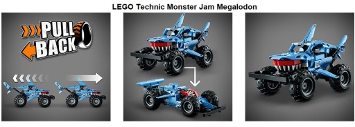 Monster truck LEGO Technic Monster Jam Megalodon z napędem typu pull-back, można go napędzać ręcznie i puszczać aby jechał sam i pokazał świetne wyskoki kaskaderskie.