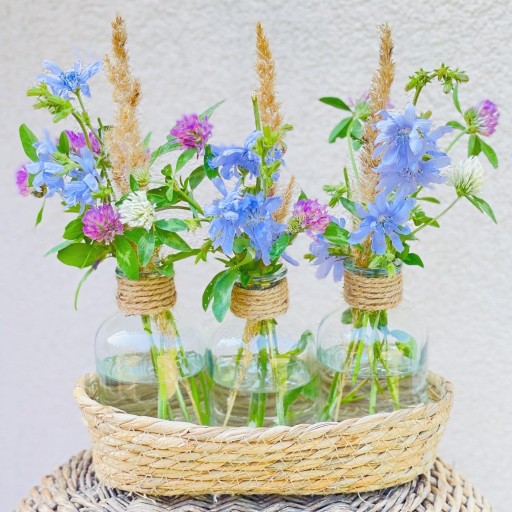 W wiklinowym koszyczku wstawiono trzy szklane buteleczki, które pełnią rolę wazoników. Udekoruj je akcesoriami domowymi, aby stworzyć wnętrze o rustykalnym wyglądzie. Buteleczki idealnie nadają się np. do suszonych kwiatków lub żywych.