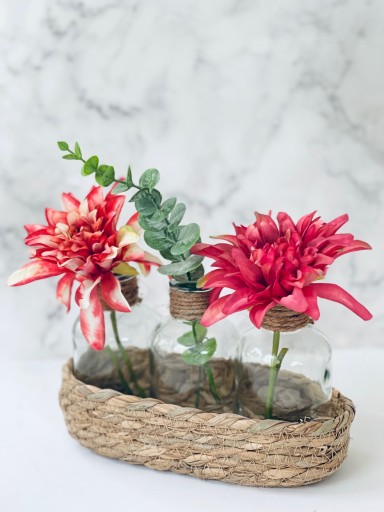 Świetnie sprawdzą się jako dyfuzor do patyczków zapachowych. Możesz do dwóch buteleczek wstawić po kwiatku a do środkowego wlać zapach lub olejek eteryczny i włożyć patyczki dzięki temu będziesz mieć śliczną dekorację i odświeżacz powietrza.