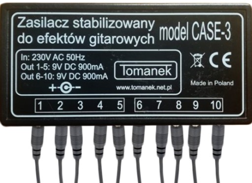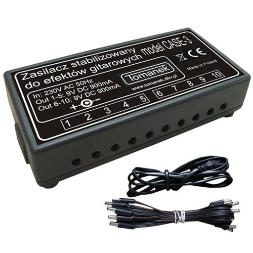 Wysokiej jakości stabilizowany zasilacz Tomanek CASE-3 z możliwością podłączenia do 10 efektów gitarowych cechuje się dwiema odseparowanymi sekcjami oraz filtrem pojemnościowym i zabezpieczeniami przeciwpożarowymi oraz termicznymi.