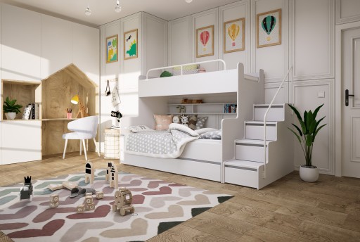 Korpus łóżka (kolor biały matowy) został wykonany z wysokiej jakości płyty laminowanej o grubości 16mm i wzmocniony elementami o grubości 22mm (łączyna przednia, stopnie).