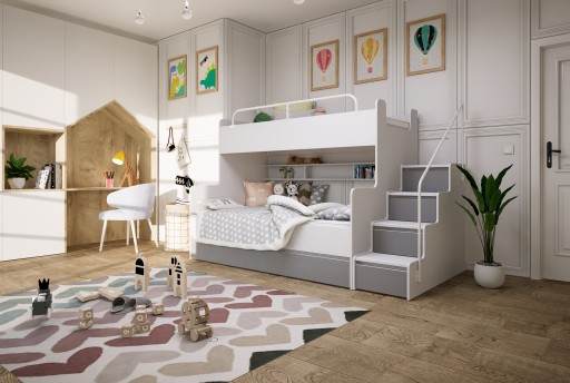 Model łóżka przeznaczonego do dziecięcej lub młodzieżowej sypialni. Mebel łączy wszystkie ważne cechy brane pod uwagę podczas projektowania pokoju dla dziecka tj.