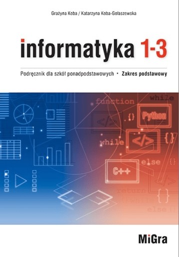 Informatyka 1-3. Podręcznik dla szkół ponadpodstawowych. Zakres podstawowy składa się z dwóch książek: Część 1. Komputer i aplikacje i Część 2. Algorytmika i programowanie. Są to podręczniki przeznaczone do nauki informatyki w szkołach ponadpodstawowych na poziomie podstawowym. Prezentowane w podręcznikach metody, pojęcia i przykłady uwzględniają różnorodność oprogramowania jaka występuje w szkołach. Podręczniki podzielono tematycznie na dwie części ze względów funkcjonalnych (fizycznie dwie książki kupowane razem). Treści można realizować w dowolnej kolejności, dostosowując je do potrzeb i możliwości uczniów. Pracę z drugą częścią podręcznika Algorytmika i programowanie do nauki informatyki dla klas 1-3 uczniowie mogą kontynuować w dowolnej chwili. Nauczyciel nie musi przekonywać uczniów do zakupu podręcznika w drugiej i trzeciej klasie – egzemplarz kupiony w klasie pierwszej uczeń wykorzystuje w późniejszych latach. Część 1. Komputer i aplikacje obejmuje: komputer, urządzenia cyfrowe, sieci komputerowe, Internet, edytor tekstu, prezentacje multimedialne, grafika komputerowa 2D i 3D, arkusz kalkulacyjny, bazy danych, strony WWW, projekty – rozwój IT. Część 2. Algorytmika i programowanie obejmuje: pozycyjne systemy liczbowe, programowanie w języku C++ lub Python, wybrane algorytmy i techniki algorytmiczne i ich programowanie, projekty – elementy robotyki z wykorzystaniem Arduino.