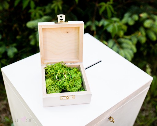 Warto zadbać także o niepowtarzalną oprawę dla obrączek. Nasze pudełko wypełnione zielonym mchem chrobotkiem pięknie je wyeksponuje i będzie stylową dekoracją.