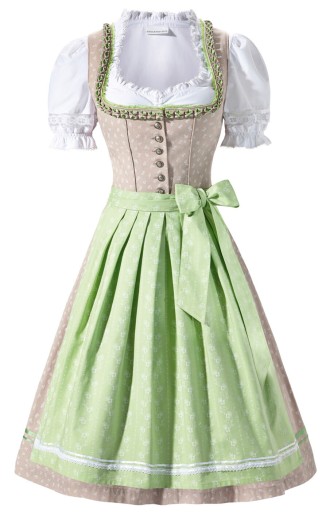 Śliczna oryginalna,bawarska sukienka w kolorze cappuccino z fartuszkiem w soczystym kolorze zielonego jabłuszka. .