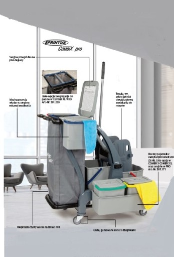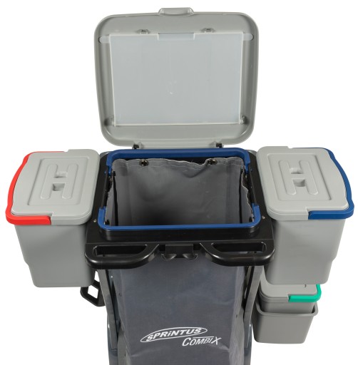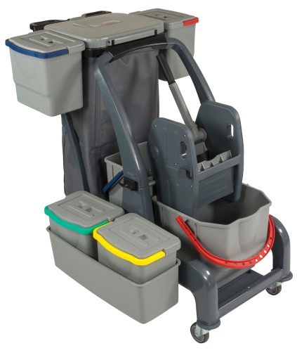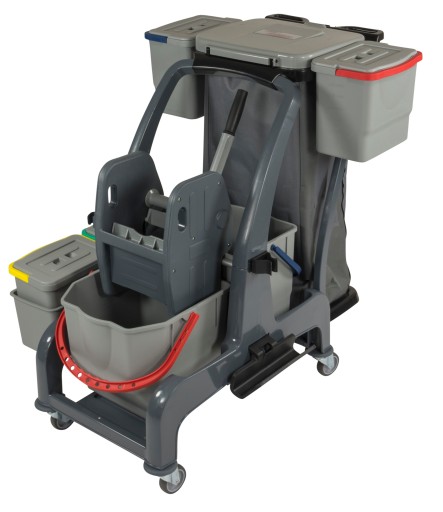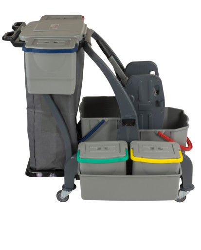 Standardowo wózki serwisowe dostarczane są wraz pojemnikami, boczną półką na mopy, pojemnym workiem na pranie / odpady (120 litrów) i dwuszczękową prasą do wyciskania mopów.