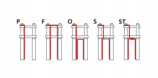 W motocyklach z dwiema tarczami hamulcowymi z przodu przewody hamulcowe mogą być różnie poprowadzone. W przypadku niektórych modeli jest możliwość wyboru pomiędzy różnymi typami układów (np. F lub O), co jest zaznaczone w nagłówku tej aukcji. Z naszego doświadczenia wynika, że przy normalnym użytkowaniu różnica w skuteczności działania poszczególnych układów nie jest zauważalna. W przypadku każdego układu w komplecie są wszystkie śruby potrzebne do montażu. Poniżej prezentujemy różne typy układów.