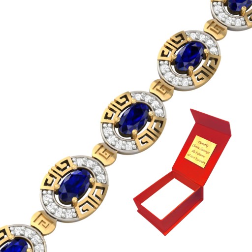 Niezwykle elegancka, ażurowa bransoletka starannie wykonana z żółtego złota próby 333. Ogniwa zdobione greckim wzorem zawierają szafiry oraz liczne cyrkonie. Miejscowe pokrycie białym rodem zapewnia bransoletce niezwykłą trwałość.