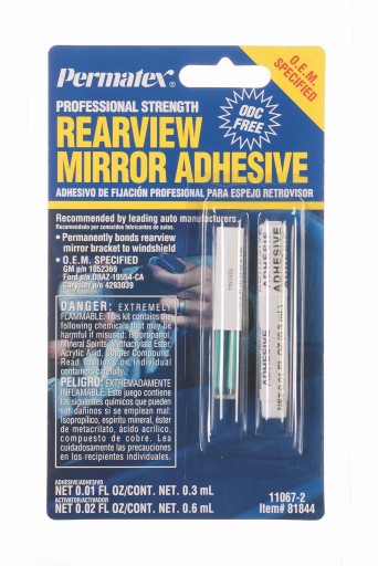 Klej do mocowania lusterka wstecznego trwale wiąże podstawę montażową lusterka z szybą przednią pojazdu. Złącze osiąga wytrzymałość roboczą po kilku sekundach, a wytrzymałość całkowitą po 30 minutach. Nie nadaje się do mocowania lusterek z podstawami wykonanymi z tworzyw sztucznych. Posiada dopuszczenie OEM.