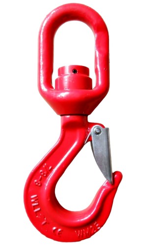 WYKONANIE: Hak z ogniwem obrotowym typu krętlik na łożysku kulkowym , który pozwala na swobodnie obracanie pod obciążeniem wokół własnej osi przy zachowaniu równomiernego rozkładu sił z możliwością kompensowania luzu osiowego. Hak wykonany ze stali stopowej kutej matrycowo w klasie wytrzymałości 8. Hak posiada zapadkę sprężynową zabezpieczającą przed wypięciem liny lub innego cięgna pod obciążeniem dzięki temu są wyjątkowo bezpieczne w użytkowaniu.
