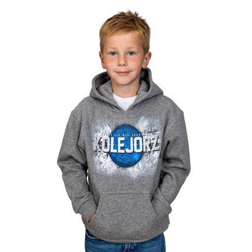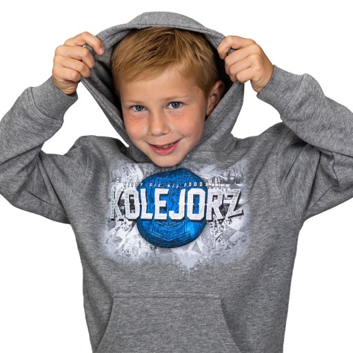Bluza kangurka z kapturem w szarym kolorze z ciekawą grafiką w którą wkomponowano m.in. herb Lecha Poznań oraz dobrze znane wszystkim kibicom Kolejorza hasło "Nigdy się nie poddawaj".