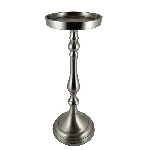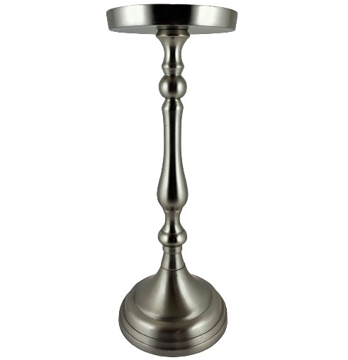 Metalowy świecznik z nogą w kolorze srebra, przeznaczony na jedną świecę.