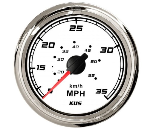 Wysokiej jakości prędkościomierz do łodzi firmy KUS. Wykonany z wytrzymałego tworzywa i wykończony ramką ze stali nierdzewnej AISI 316. Całkowicie wodoodporny. Posiada dwa kolory podświetlenia tarczy, czerwony i żółty, podłączamy wg. gustu. (Należy dokupić czujnik z rurką kod 03721 lub 03722). Można dokupić kostkę łączeniową kod: 03324 (na naszych aukcjach).