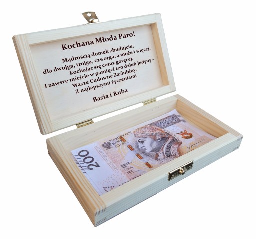 Chcesz elegancko wręczyć prezent w postaci gotówki? Mamy dla Ciebie rozwiązanie - pudełko na pieniądze na ślub, wesele,  dla młodej pary, grawerowane pudełko jest idealnym prezentem. Prezent 3 w jednym: etui na banknoty, życzenia zastępujące kartkę oraz pudełko, które będzie pamiątką może służyć jako pudełko na drobiazgi.