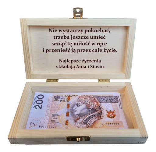 Chcesz elegancko wręczyć prezent w postaci gotówki? Mamy dla Ciebie rozwiązanie - pudełko na pieniądze na ślub, wesele, dla młodej pary, grawerowane pudełko jest idealnym prezentem. Prezent 3 w jednym: etui na banknoty, życzenia zastępujące kartkę oraz pudełko, które będzie pamiątką może służyć jako pudełko na drobiazgi.