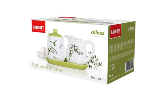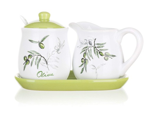 4-częściowy zestaw OLIVES, zestaw zawiera: 1x 260 ml mlecznik, 1x 280 ml cukierniczka, 1x łyżeczka, 1x taca, materiał ceramiczny, Jasny zielony - biało ceramika z oliwkowa dekoracją.