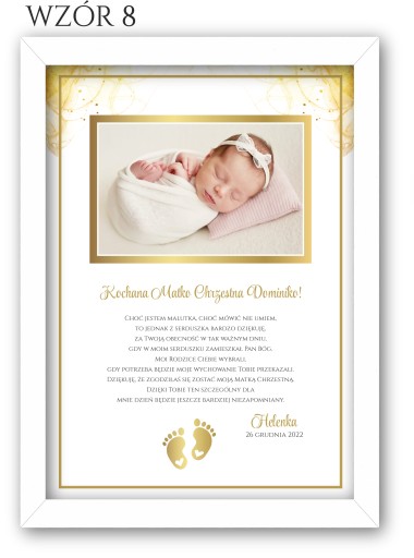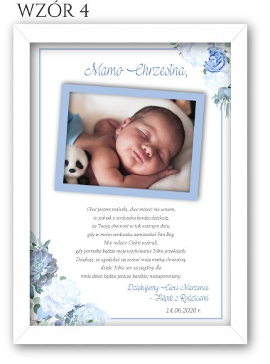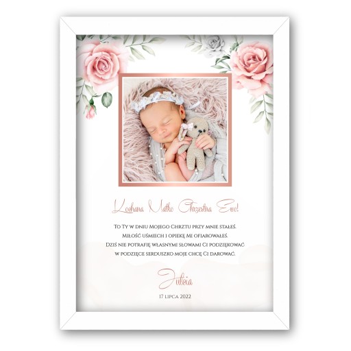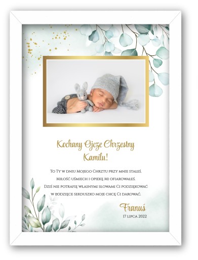 Eleganckie podziękowanie ze zdjęciem dla Rodziców Chrzestnych i Dziadków w białej ramce, by okazać wdzięczność najbliższym z okazji przybycia na Chrzest Święty.