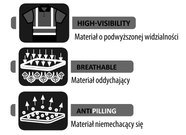 - pasy odblaskowe zgodne z normą EN ISO 20471 w połączeniu z materiałem ostrzegawczym zapewniają wysoką klasę widzialności: klasa 2