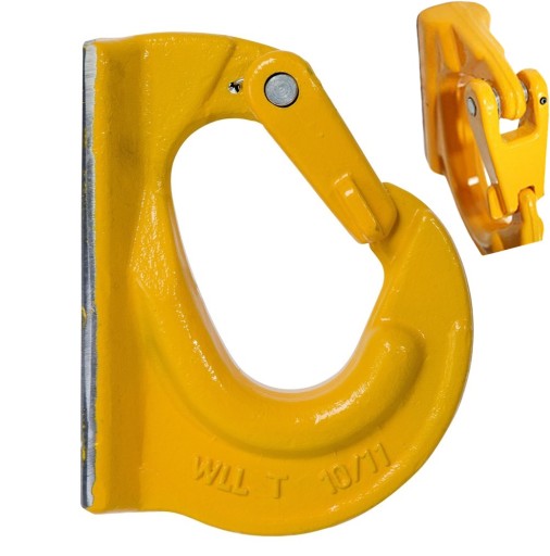 Hak do przyspawania z płaszczyzną bez lakieru wykonany z wysokiej jakości stali stopowej kutej matrycowo [42Cr MO]. Gatunek 80 (kuta i hartowana). Połączenie haka do elementu bazowego metodą spawalniczą. Hak wyposażony w zapadkę, która pozwala zabezpieczyć zamocowane cięgno /zawisie łańcuchowe, pasowe ..i inne/ przed wypięciem, jednocześnie sprężyna skrętna umieszczona między hakiem a zapadką zapewnia pewne doleganie zapadki ograniczając hałas wywołany drganiami.