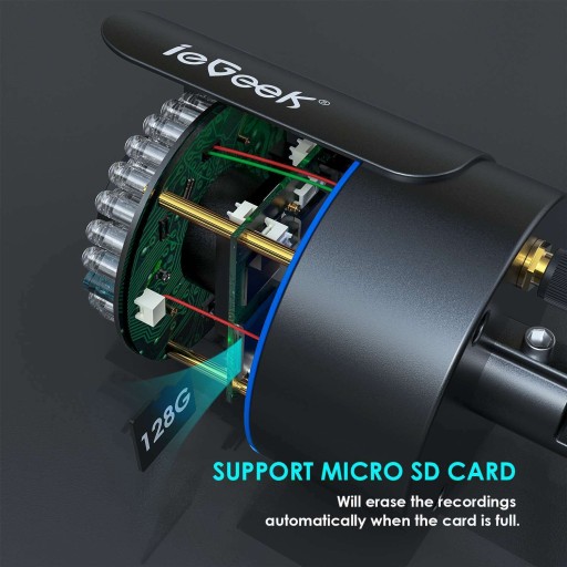 Kamera ieGeek obsługuje funkcję nagrywania w pętli za pomocą karty micro SD (maks. 128 GB, NIE ZAWARTE W PAKIECIE). Nie musisz co miesiąc płacić za przechowywanie w chmurze.