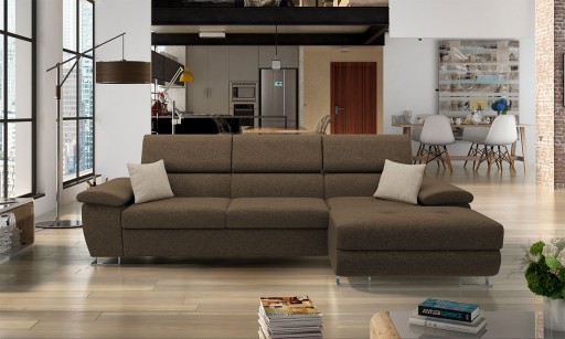 Prosta forma, oryginalna kolorystyka. Przednie, metalowe nóżki w kolorze chromu nadają meblu elegancji i wdzięku. Atutem rogówki jest możliwość rozkładania. Przemień narożnik w wygodne łóżko. Zwróć szczególną uwagę na wewnętrzny pojemnik, w którym przechowasz pościel, koc lub wybrane sezonowe ubrania. Praktyczne, regulowane zagłówki i niewielkie, luźne poduszki pomogą Ci dostosować odpoczynek do własnych potrzeb.