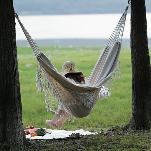 Nie ma nic lepszego niż odpoczynek na miękkim hamaku.Wystarczy przywiązać dwa jego końce do drzew lub wytrzymałych słupków i gotowe. Hamak wykonany jest z wytrzymałego materiału (gruba bawełna z domieszką poliestru), podobnie jak grubo plecione sznury. Nie zmienia to jednak faktu, że jego materiał jest przyjemny i oddychający, co tylko poprawi komfort użytkowania.