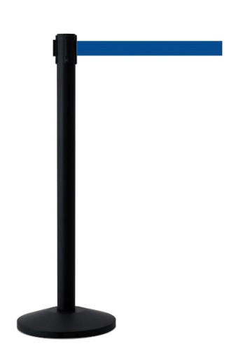 Do zaoferowania mamy słupki odgradzające wykonane ze stali malowanej proszkowo na kolor czarny z taśmą o długości 2,5 m w kolorze niebieskim - długość taśmy jest płynnie regulowana poprzez mechanizm samo-zwijający.